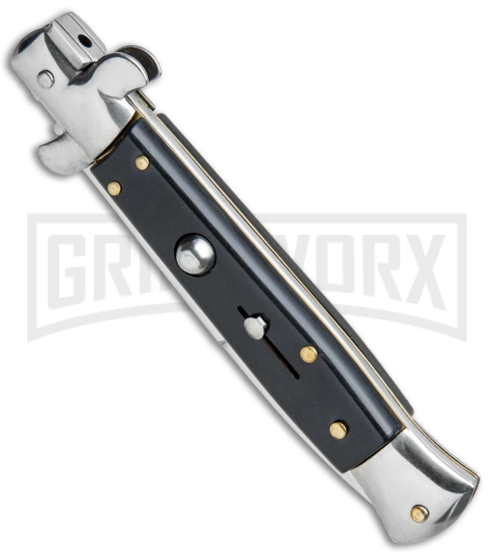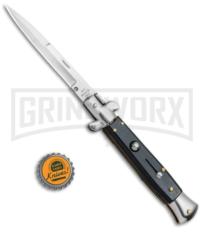 The Anomaly Stiletto offers an automatic Italian stiletto inspired design at an affordable price. It has a black acrylic handle with an automatic push button and a sliding safety. The stainless steel blade comes in a bayonet style with a plain cutting edge. A swivel bolster locks the blade up tight and swivels forward to release. The Anomaly Stiletto provides a great introduction to the world of Italian style stiletto knives.