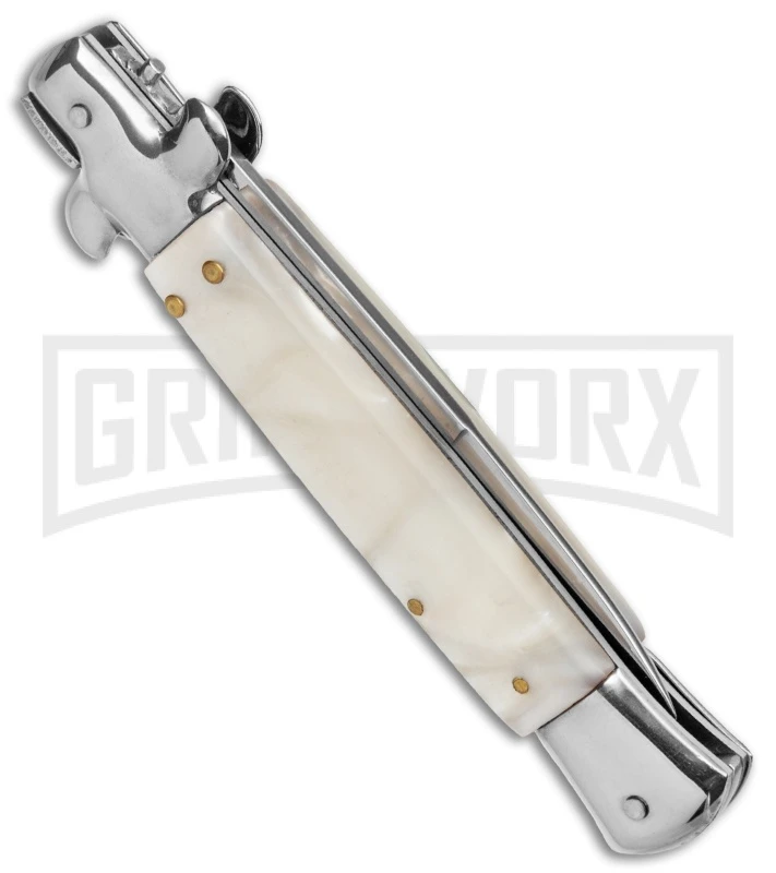 This 9″ Italian-Style stiletto features white acrylic scales and a bayonet blade.