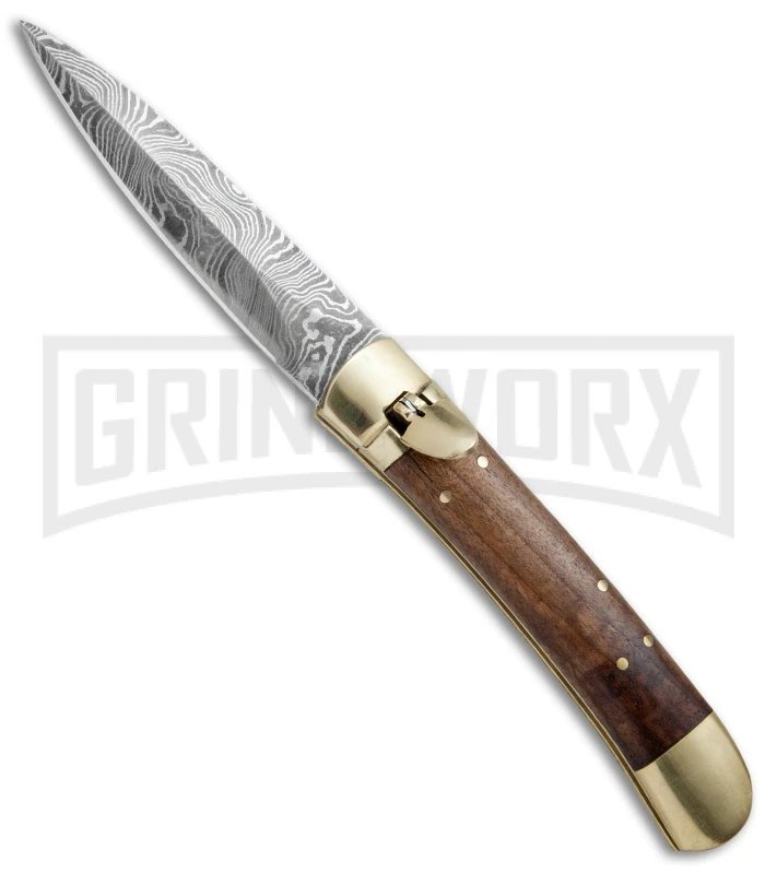 This Leverlock model features a damascus dagger blade and a wood handle with brass bolsters. These handcrafted automatic knives are just like the fancy Italian leverlocks without the painful price tag! When you press the lever release the action is fast and the lock-up is solid. These have genuine dark wood handle scales with brass bolsters and file work along the spine. Add a great alternative to the Italian made Leverletto to your collection, at a great price.