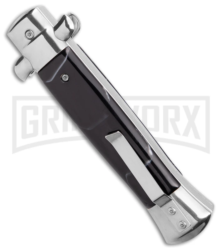 This Mago OTF model features a satin finished bayonet blade and an acrylic black handle with a pocket clip.