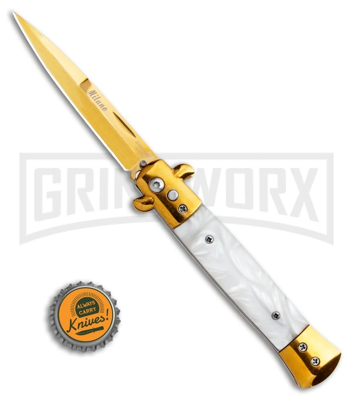 Looking for an Italian-style knife but not looking to invest boat-loads of money? Then the Milano is for you! This Milano has a white marbled acrylic handle with gold-colored bolsters and a bayonet style, gold-finished blade. This knife has push-button automatic action with a sliding safety lock to prevent unintentional firing. A deep-carry, tip-up pocket clip completes this modern-style, budget friendly folding knife.