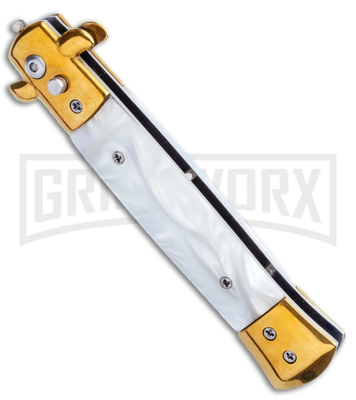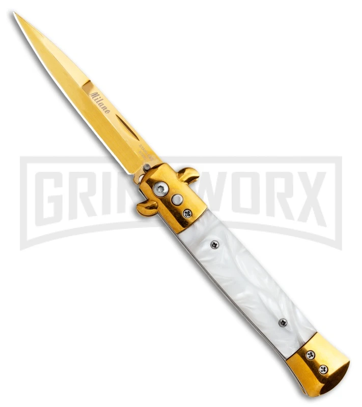 9″ Milano Stiletto White Marble Acrylic Automatic Knife – Gold Plain