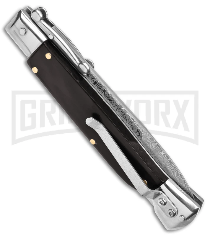 This real Italian swinguard features a Damascus steel bayonet blade and ebony handle for an elegant look. A sliding safety prevents accidental release and lockback is secure. Unfurling your blade is as easy as pressing a button. Enhance your Italian knife collection with this classy addition!