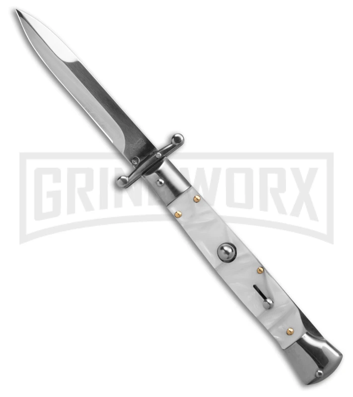 AKC 9″ Italian Stiletto Swinguard White Pearlex Automatic Knife – Polish Plain