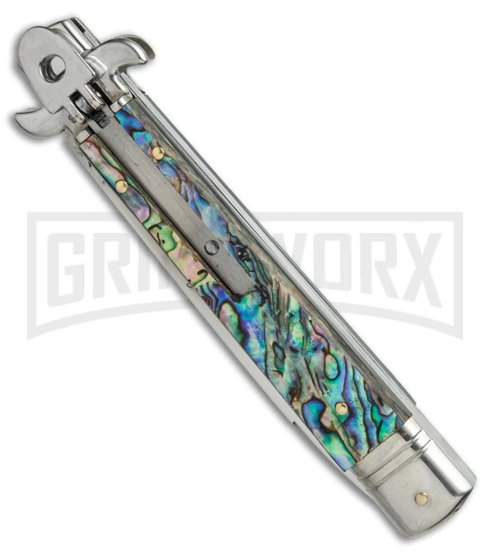 The perfect synthesis of a stiletto and a lever lock is here: the Leverletto. Made by AKC, the Leverletto features excellent workmanship and reliable action. This model is equipped with abalone shell handle scales. The flat grind, stainless steel blade showcases a high polish finish with the Leverletto name etched across the blade. When you press the lever release, the action is fast and the lock-up is solid. These knives make beautiful collector pieces and are sure to be a treasured part of any collection.