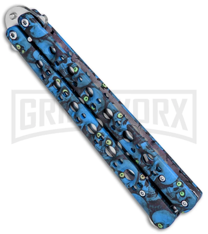 This Skull Fly Butterfly Trainer has a stainless steel handle with a blue skull camo finish and a satin finished trainer blade.