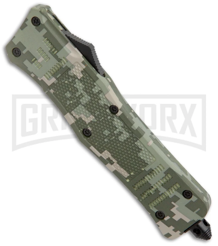 This Atomic OTF model has a Digi camo handle and a two-tone finished dagger blade with serrated edges.