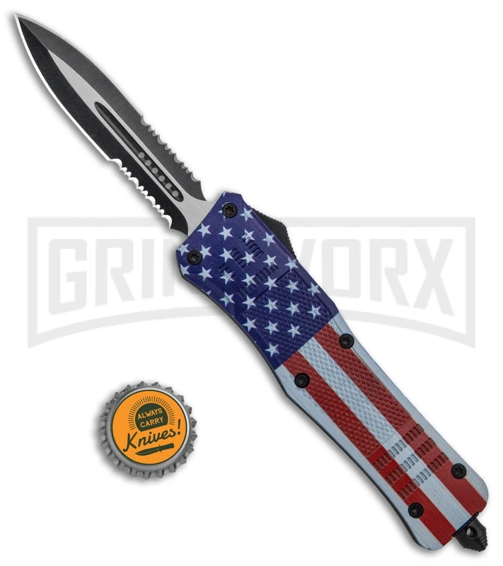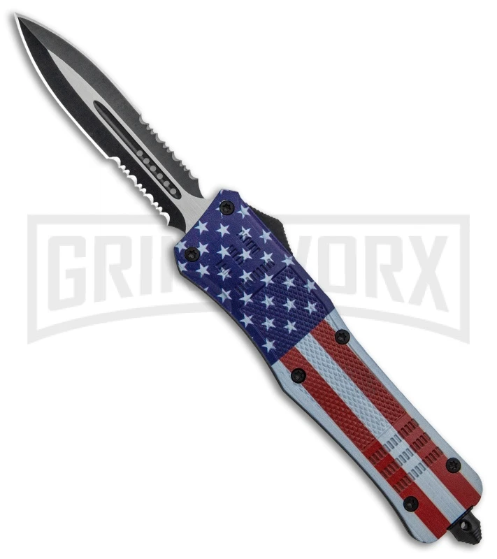 This Atomic OTF model has a US Flag finished handle and a two-tone finished dagger blade with double partial serrations.