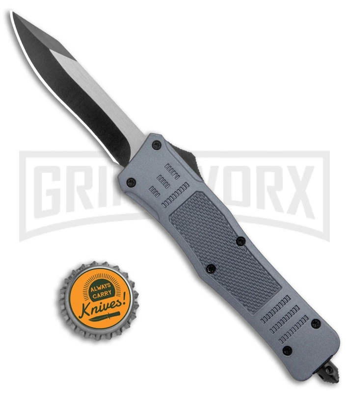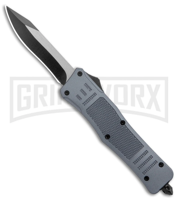 The Atomic Defender OTF Knife model has a gray handle and a two-tone clip point blade with a plain edge. It features a rugged design with solid EDC construction. The handle is textured for improved grip with a pocket clip for tip-down carrying comfort. Using the side mounted slide button activates the double-action, automatic feature, for lightning fast blade deployment. A pommel glass breaker finishes off the tactical design. It also comes with a Velcro, nylon carrying case.