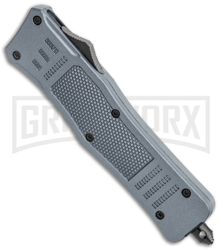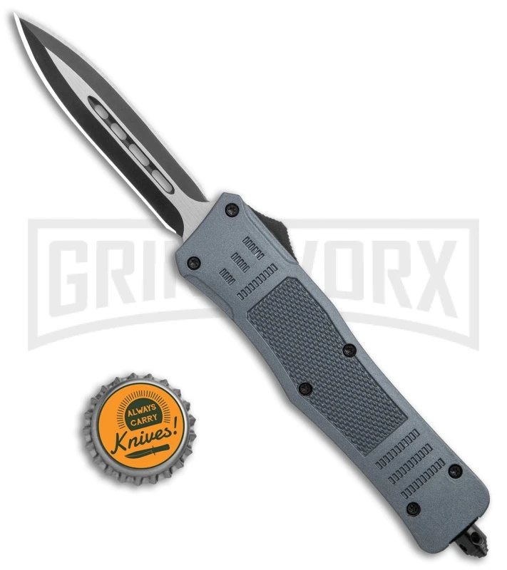 This Atomic OTF model has a gray handle and a two-tone finished dagger blade with a plain edge.