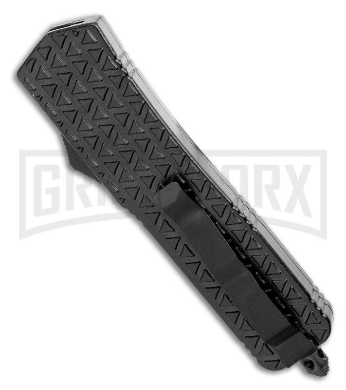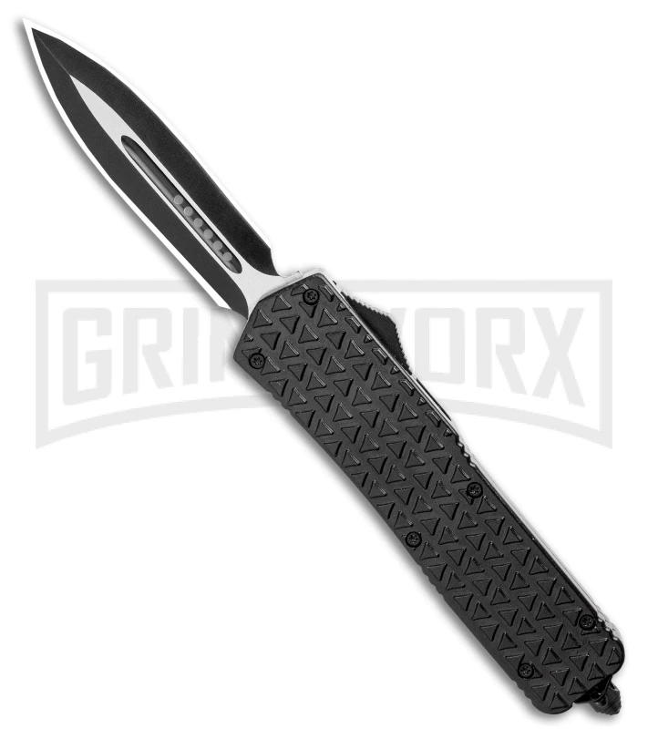 This Atomic OTF model has a black aluminum handle with triangular texture and a two-tone finished dagger blade with plain edges.