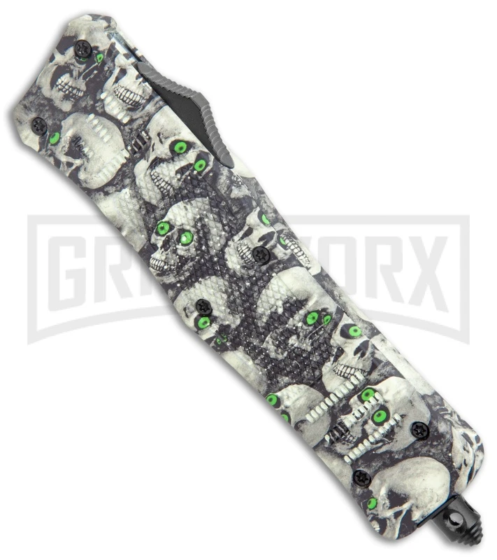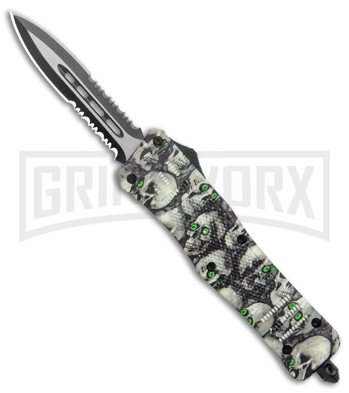 The Atomic OTF Defender offers a rugged design with solid EDC construction. This model has a two-tone stainless steel dagger blade with a double serrated edge. It has a durable handle for maximum grip and a pocket clip for comfortable tip-down carry. It comes with a stylish black-nylon case that fits easily on your belt. The side mounted slide button will activate the double-action automatic feature for lightning fast blade deployment. A pommel glass breaker finishes off the tactical design.