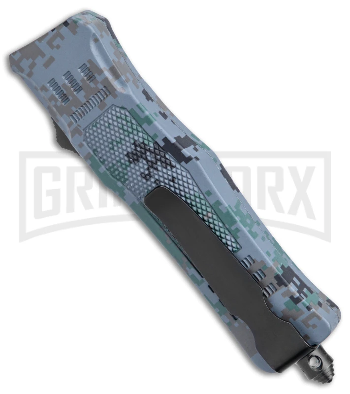 This Mini Defender model has a two-tone dagger blade with a partially serrated edge and a digi camo handle.
