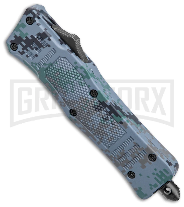 This Atomic OTF model has a green digi-camo handle and a two-tone drop point blade with a plain edge.