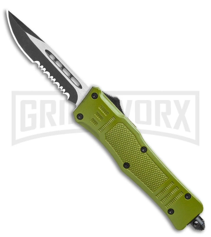 This Atomic OTF model has a OD green handle and a black and satin finished drop point blade with a serrated edge.