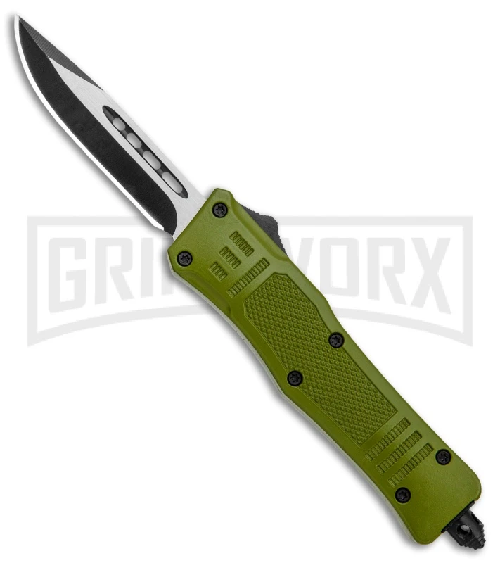 This Mini Defender model has a two-tone drop point blade with a plain edges and an OD green handle.