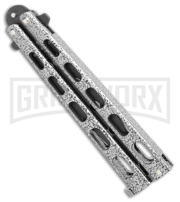 The Bear & Son 115TR butterfly knife trainer is built with durable silver vein epoxy coated zinc handles with a skeletonized design for reduced weight. It features a stainless steel drop point blade with a black coating.