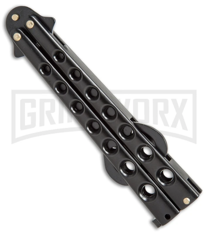 Keep your flipping skills finely honed with this Butterfly trainer Bottle Opener from Caliber Gourmet. It features a fully functional bottle opener on the blade, so you can safely practice butterfly tricks without cutting up your hands. The handles are made from skeletonized aluminum with a latch for securing the blade in the open or closed position. This model has a black finished handle and blade.