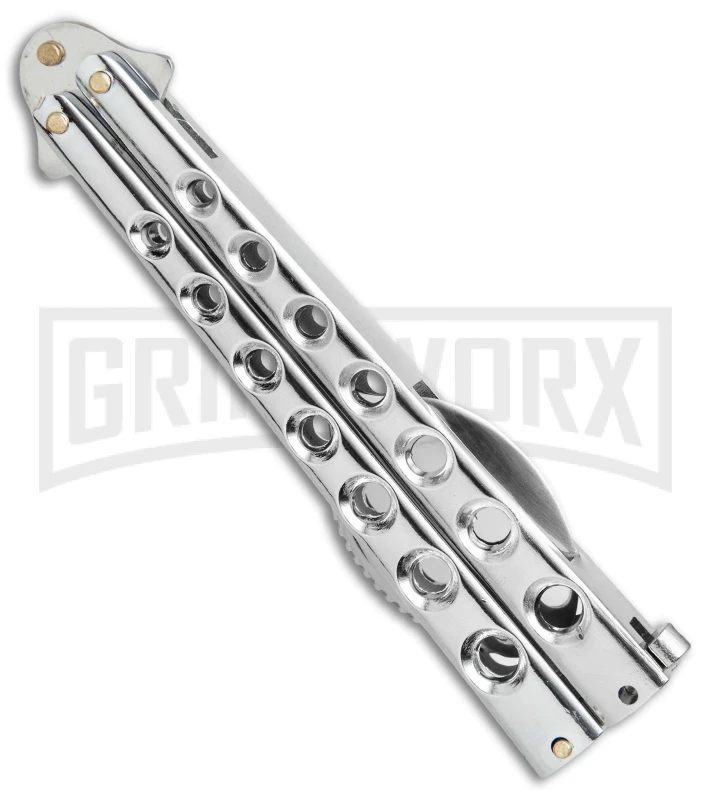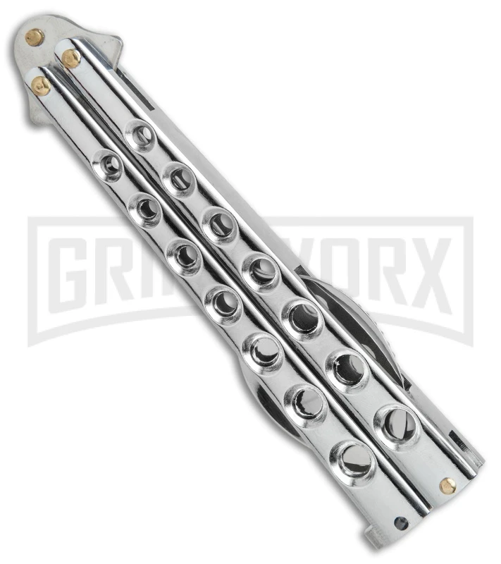 Keep your flipping skills finely honed with this Butterfly trainer Spoon from Caliber Gourmet. It features a fully functional spoon on the blade, so you can safely practice butterfly tricks without cutting up your hands. The handles are made from skeletonized aluminum with a latch for securing the spoon in the open or closed position. This model has a satin finished handle and spoon.