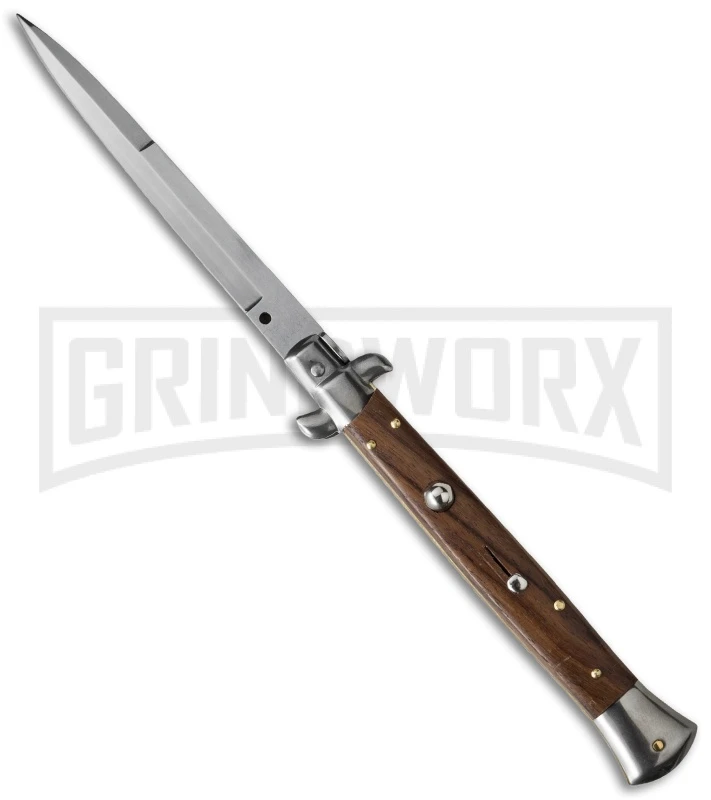This classic Italian stiletto has real Cocobolo scales and a stainless bayonet blade. The knife features fast auto action and lock-up from the push button, and protection against accidental release with the sliding safety. Polished bolsters and hardware make this a beautiful addition to your Italian collection.