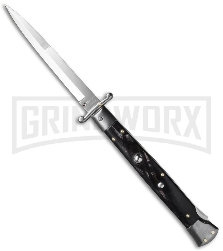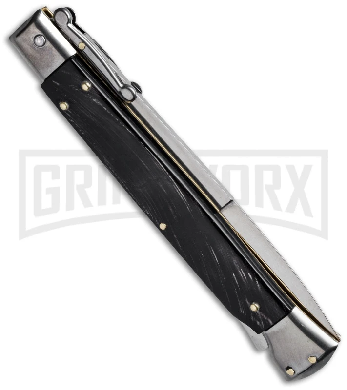 This 11″ stiletto from Frank B. is an excellent quality traditional Italian knife. This knife features a stainless steel bayonet blade, firing button, and rich dark horn handle scales. It has polished nickel silver bolsters and buttons, and beautiful brass pins and liners. The base of the blade features a finger guard which swings into place as the blade opens; thus the name “swinguard” for this style. There is a sliding safety on the handle as well to protect against accidental release of the blade. The action on this knife is fast and the lock up is secure. “Frank B Italy” is stamped on the blade tang for authenticity.