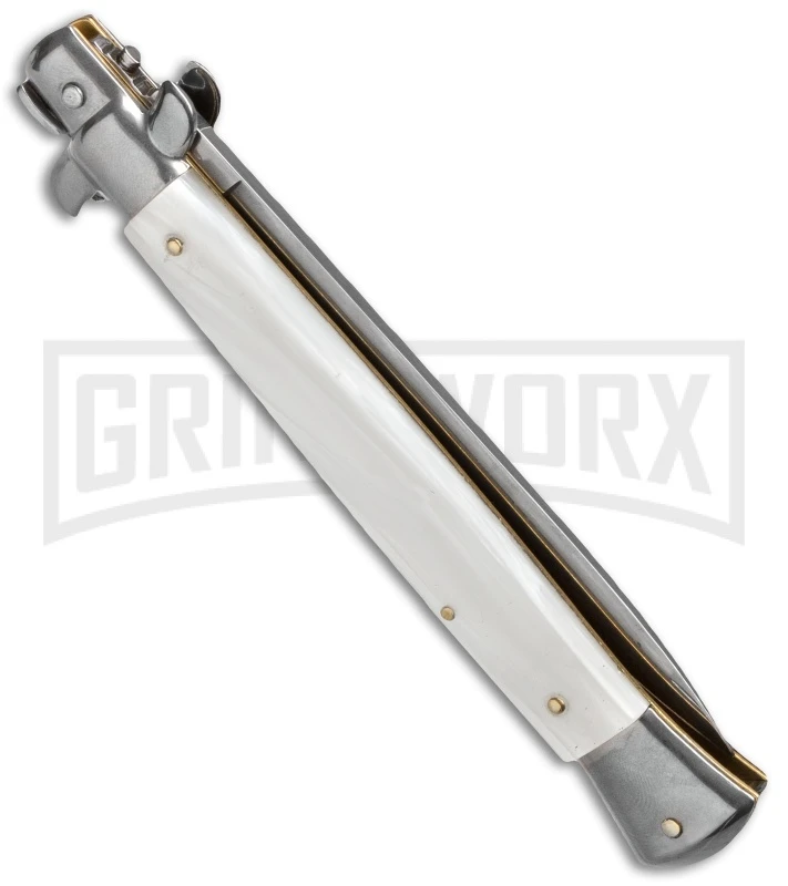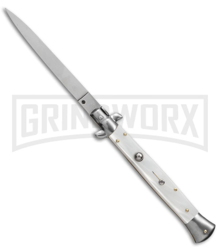 Frank B. 11″ Italian Stiletto White Pearlex Automatic Knife – Flat Grind