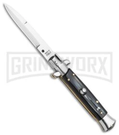 This classic 7.5″ Frank B. Italian stiletto is outfitted with simulated dark horn handle scales and a polished bayonet blade. The knife features fast automatic action with a front-loaded push button, and protection against accidental release with the sliding safety. Polished bolsters and hardware will make this a beautiful addition to any Italian collection.