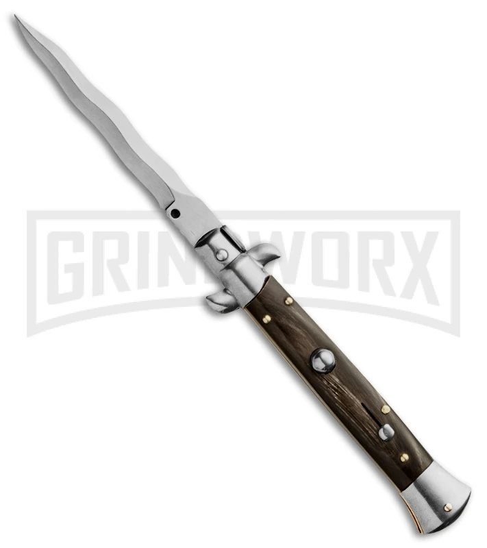 The unique kris blade makes this stiletto an excellent choice to begin or add to your Italian collection. The blade is a polished stainless steel and is stamped “FRANK B ITALY” on the tang. The traditional dark horn handle is set with polished nickel silver buttons and brass pins. It includes a sliding safety to protect against accidental release of the blade. Polished nickel silver bolsters and brass liners complete the ensemble. Both classy and classic.