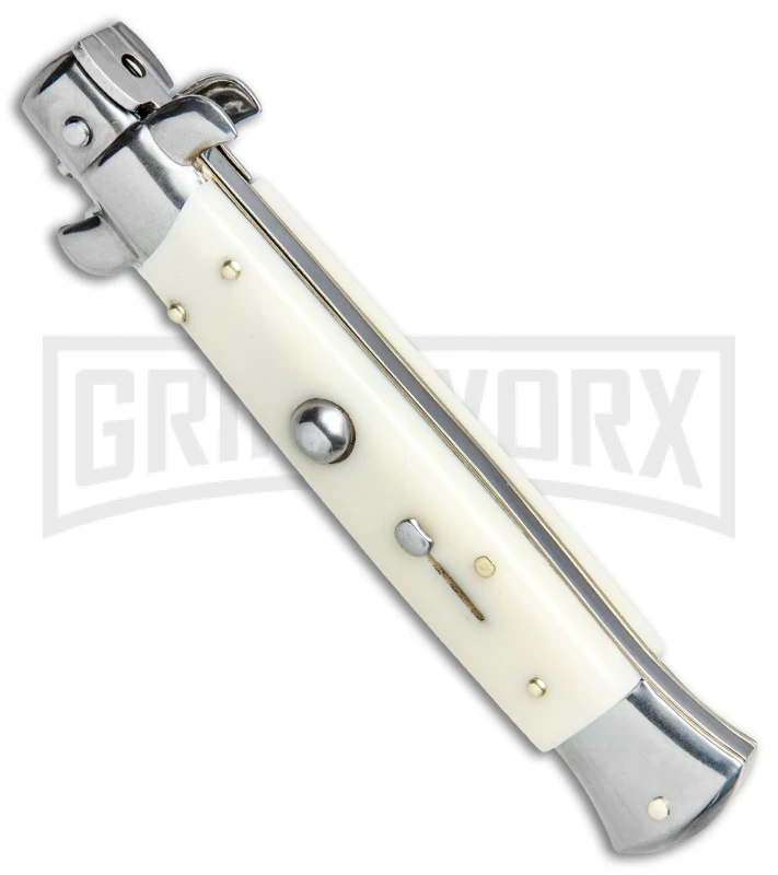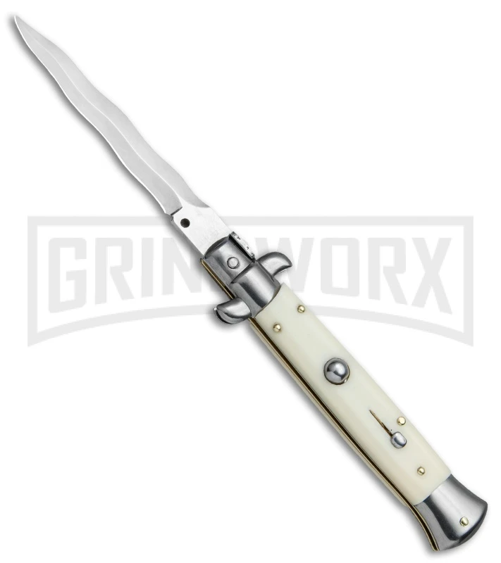This classically designed Italian stiletto features sim ivory handle scales and a stainless steel kris style blade. It has fast automatic action and lock-up from the push button, and protection against accidental release with a sliding safety. Polished bolsters and hardware add an elegant touch to the handle. This Frank B Stiletto will make a beautiful addition to your Italian auto collection.