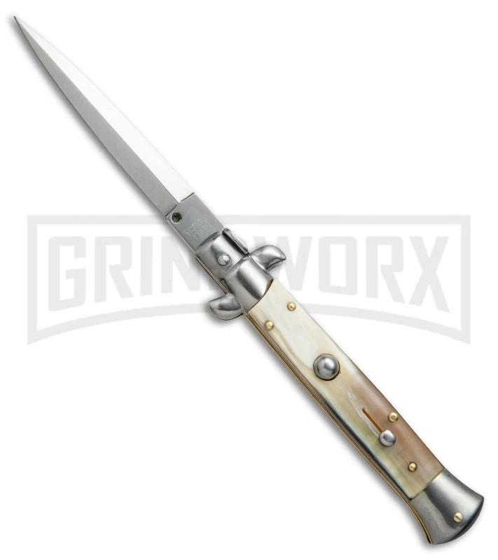 These Italian stilettos have real honey horn handles and stainless dagger blades. Fast action and a beautiful collector piece. Please note that not all the handles will look like the picture as the horn handles vary from knife to knife. These knives are manufactured by SKM. Tang says” Frank B Italy.”