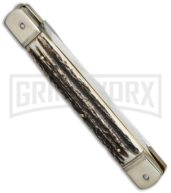 This collectible lever lock automatic knife was handcrafted in Solingen Germany. It has rugged stag horn handle scales with a nickle silver bolster and lever lock. The stainless steel blade comes in a kriss blade style with a polished mirror finish. Brass pins and liners provide a sturdy framework while adding to the classic look of the knife.