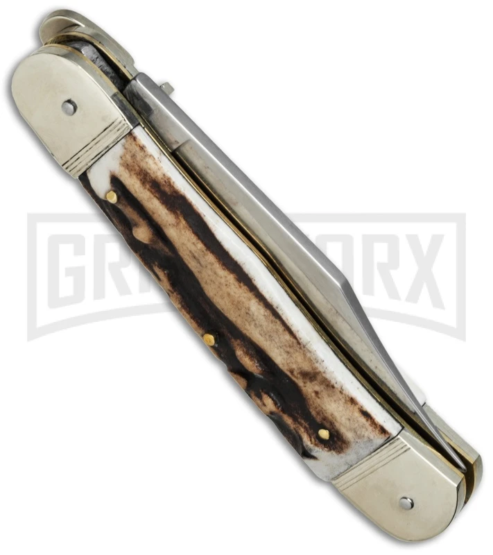 This beautifully designed lever lock automatic knife was handcrafted in Solingen Germany. It features rugged stag horn handle scales with nickle silver bolsters and lever lock. The stainless steel blade comes in a clip point style with a polished mirror finish. Brass pins and liners provide a sturdy framework while adding to the classic look of the knife.