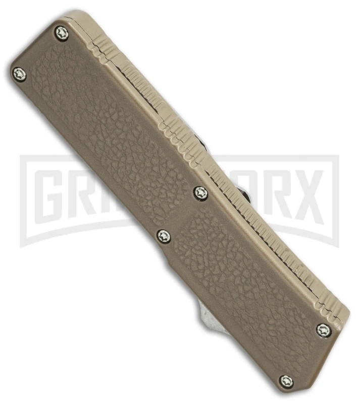This model has a tan powder coated aluminum handle with a textured surface to facilitate good grip. The firing button is mounted on the side, making the Lightning slim and easy to carry. The blade is satin finished stainless steel and comes in a double edged dagger style.