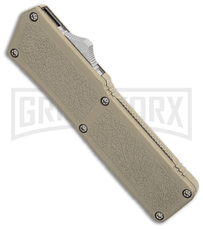 This Lightning model has a tan powder coated aluminum handle and a black finished dagger blade with serrations.