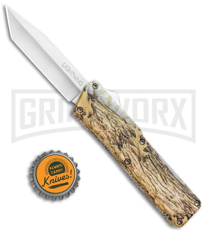 This Lightning model is outfitted with a tree camo finished handle and a satin finished tanto blade with a plain edge.