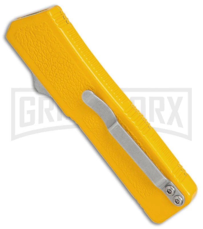 This Lightning OTF model has a double edge dagger blade with a black finish and a partially serrated edge. The yellow coated aluminum handle provides a textured surface to facilitate good grip. Its firing button is mounted on the side, making the Lightning slim and easy to carry.
