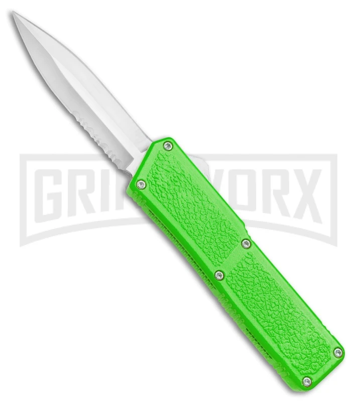 This Lightning model has a zombie green powder coated aluminum handle and a satin finished dagger blade with a partially serrated edge. The handle offers a textured surface for a high performance grip. It has a side mounted firing button that makes the Lightning easy to use and slim and easy to carry.