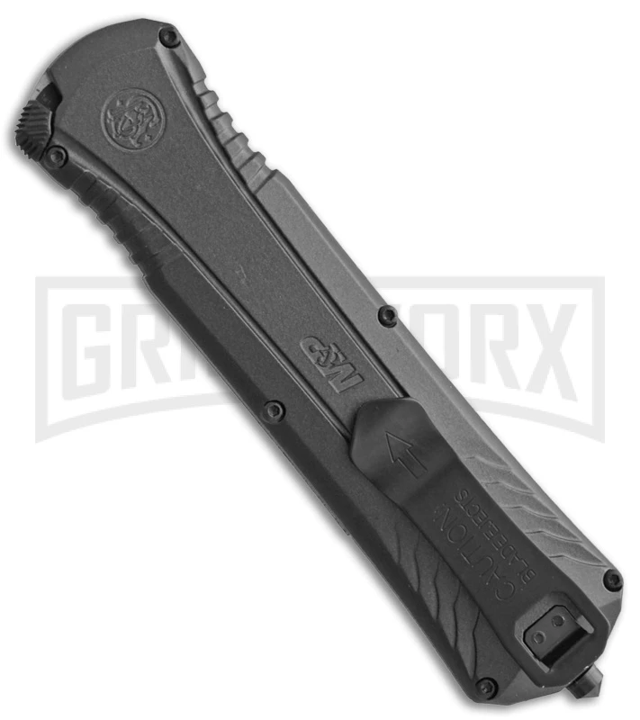This Smith and Wesson M&P has a double-edge black blade with a gray handle and spring assisted out-the-front deployment./p>