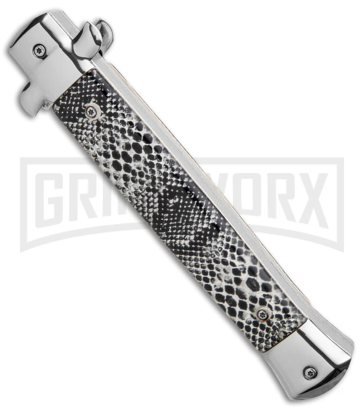 This Mago OTF model features a satin finished bayonet blade and an acrylic “Sidewinder” handle.