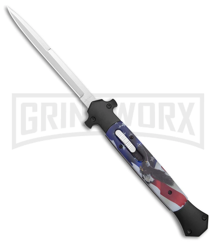 Mago 13″ Eagle / Flag D/A Italian Stiletto OTF Knife – Satin Plain Bayo