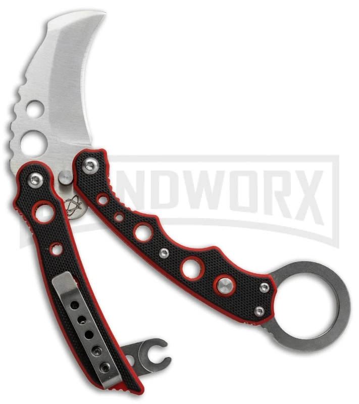 This Vuja De knife features a karambit body with a balisong/butterfly build. Black and red skeletonized G-10 and nested steel liners make up the handles, which lock open and closed using the spring loaded latch and push button lock. The Vuja De also features a finger ring and reversible tip-up carry pocket clip. The hawkbill blade is satin finished M-VX steel with deep jimping on the spine.