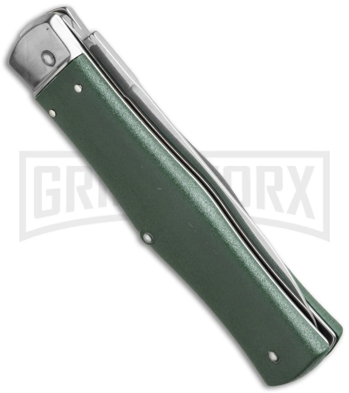 The Mikov automatic knives come from the Czech Republic. This model features green ABS scales and a dagger-style stainless blade (one side is sharp and the other is a false edge). The Mikov series is well-regarded for their “ready to work” no nonsense design. Rivet construction. The knife is opened using the small lever near the top of the knife. The lever rests flush in the handle when not in use.