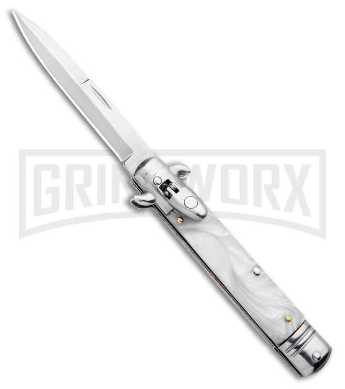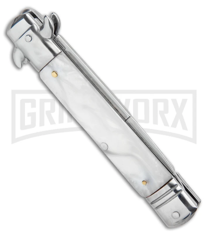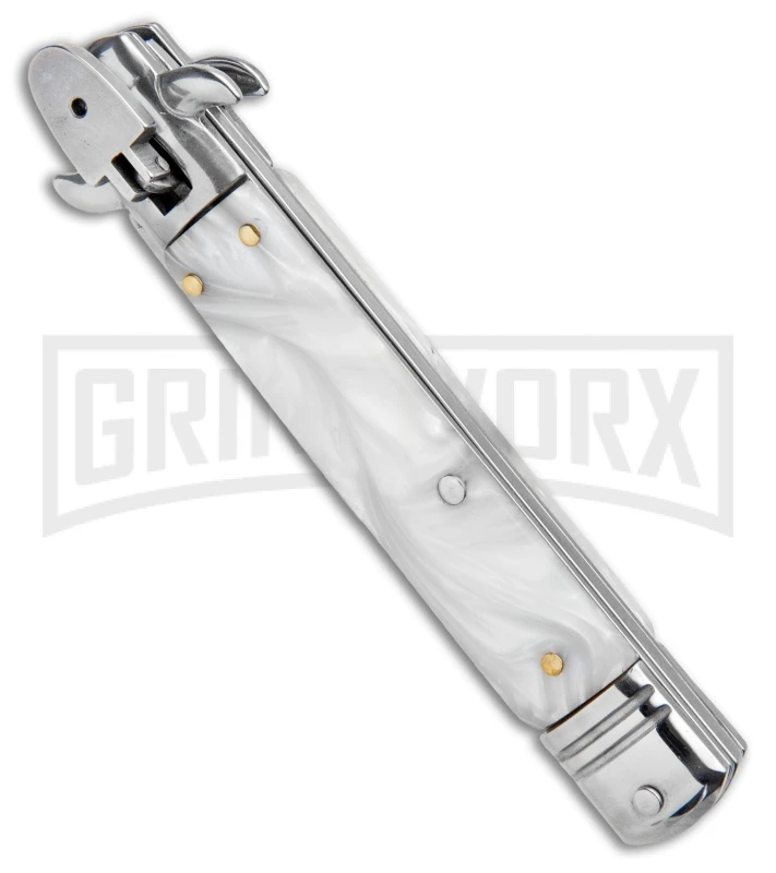 Milano 8.5″ Lever Lock Automatic Knife White Marble – Bayonet Satin