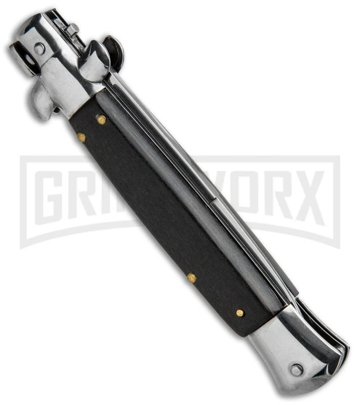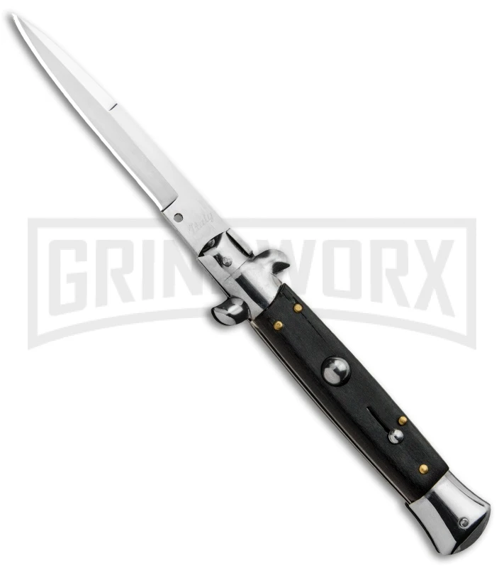 The Milano Stiletto offers a classic automatic knife design that’s easily affordable for anyone interested in Italian style knives. It’s built with a stainless steel bayonet blade and a black wood handle with nickel silver bolsters. The push button release has fast action and a solid lock up. To unlock the blade, simply push down on the swivel bolster. Item is equipped with a sliding safety to protect against accidental release of the blade. The Milano Stiletto is a great way to get your collection started.