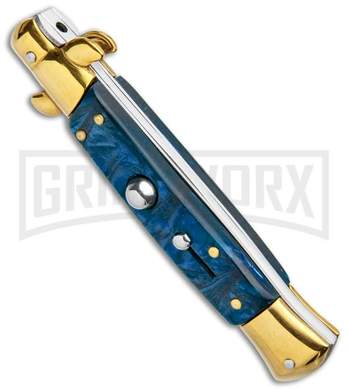 This Milano model has a gold finished bayonet blade and a blue acrylic handle with gold bolsters.