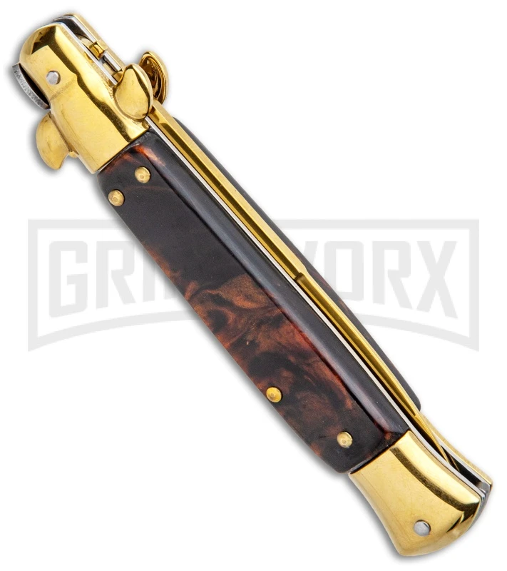 This Milano model has a gold finished bayonet blade and a brown swirl handle with gold bolsters.