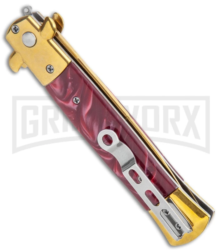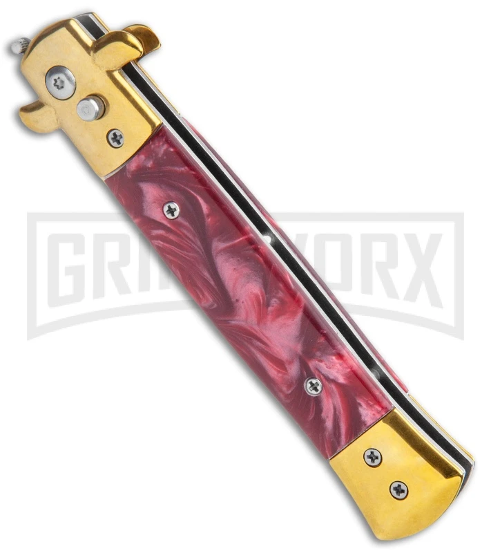 Milano 9″ Italian Stiletto Gold/Red Marble Automatic Knife – Bayonet Satin