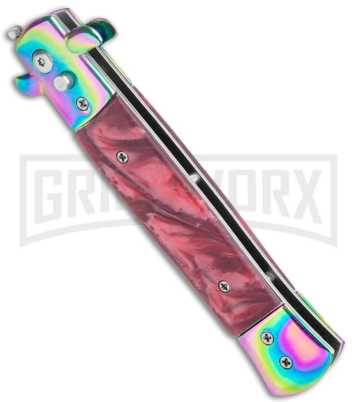 Milano 9″ Italian Stiletto Red Swirl Automatic Knife – Bayonet Spectrum