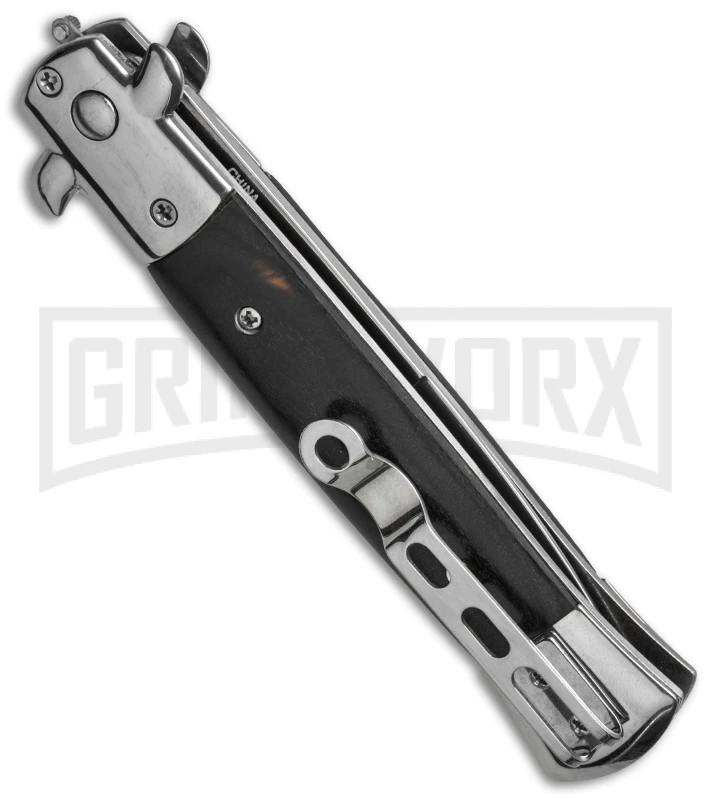 This Milano Stiletto comes in the classic Italian style. It has a razor sharp bayonet blade made from 440 stainless steel. The handle features black wood handle scales and a tip-up carry pocket clip. Add this great looking automatic to your collection today!