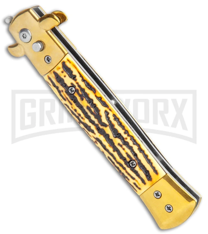 Milano 9″ Stiletto Gold Sim Stag Horn Automatic Knife – Bayonet Satin